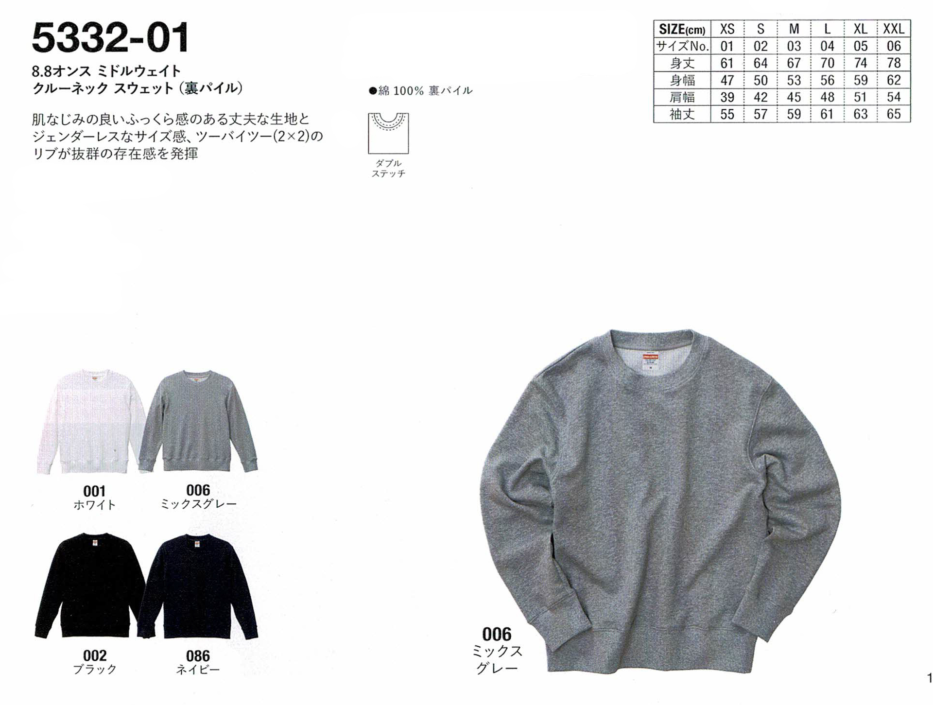 品番【5332-01 8.8オンス ミドルウェイトスウェット(裏パイル)】